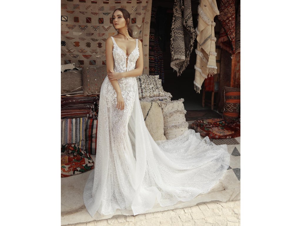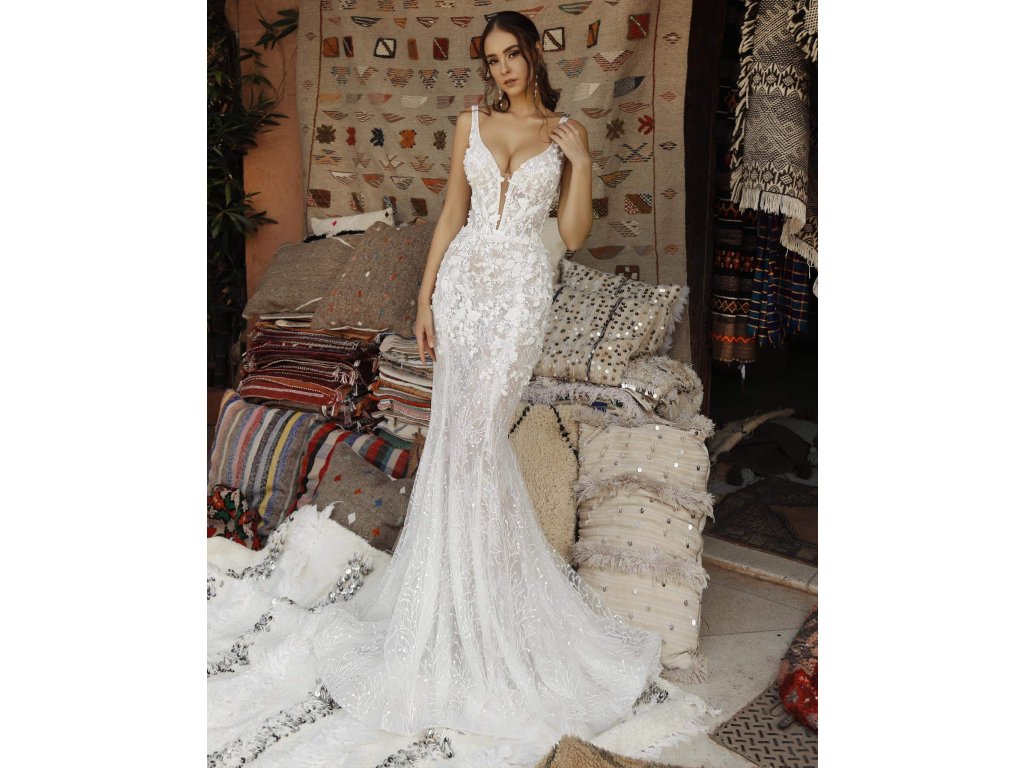 Svadobné šaty model Athena očaria jemnou čipkou, hlbokým výstrihom a splývavou sukňou s vlečkou. Elegantný strih krásne zvýrazní ženskú siluetu a pôsobí romanticky aj zvodne zároveň