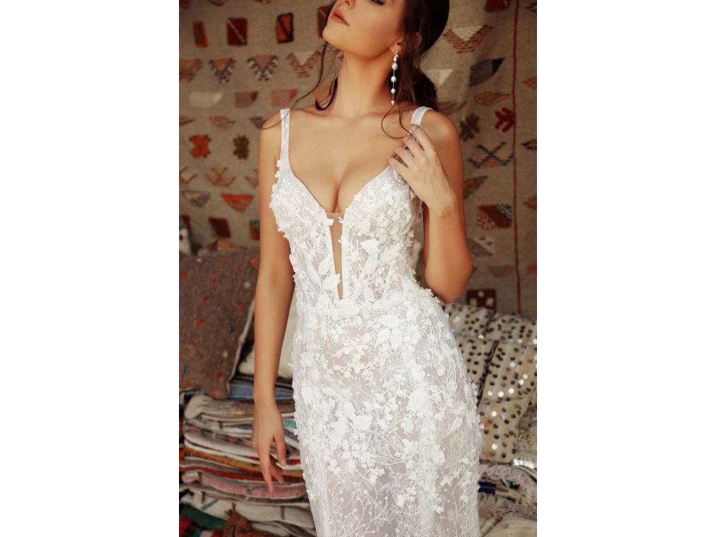 Vrchný diel vyniká bohato zdobenou čipkou s jemným transparentným efektom, ktorý dodáva šatám moderný a zároveň romantický vzhľad. Hlboký výstrih do V krásne zvýrazňuje dekolt a spolu s úzkymi ramienkami pôsobí veľmi nežne a žensky.