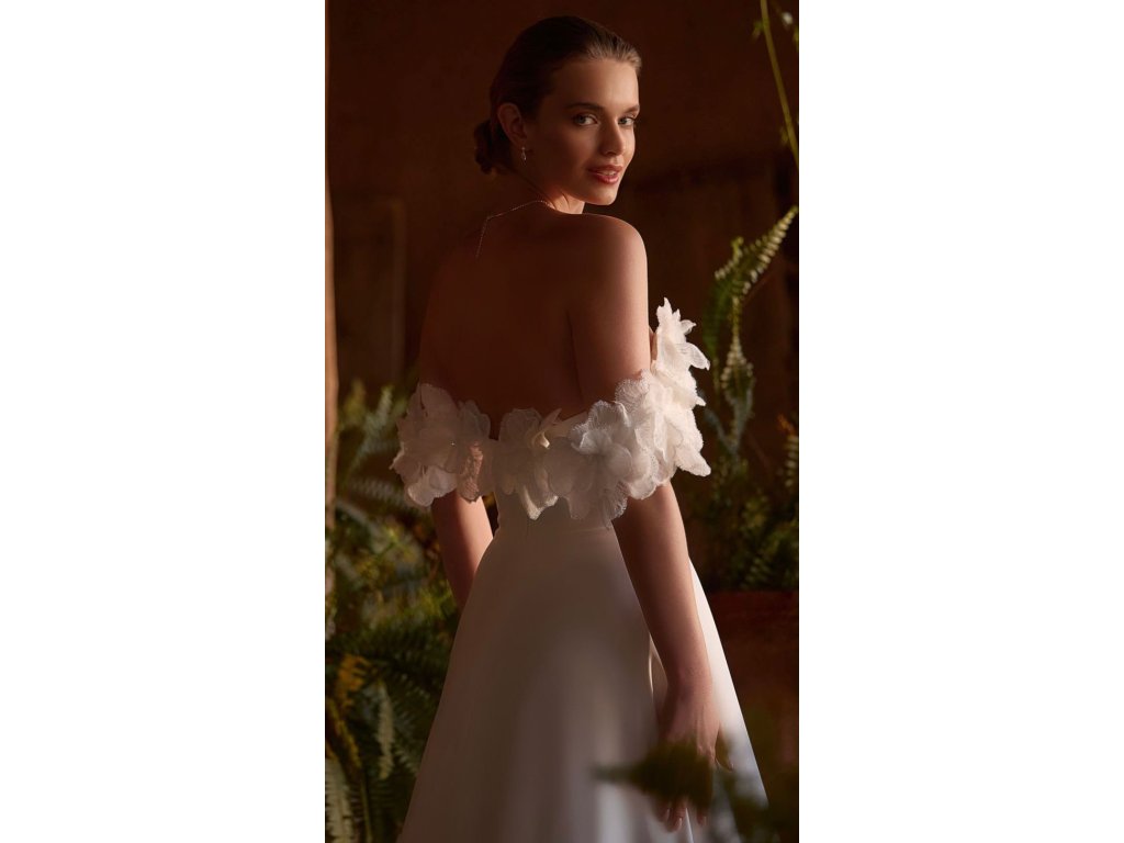 Korzetový vrch bez ramienok pôsobí čisto, elegantne a krásne zvýrazňuje líniu ramien a dekoltu. Dominantným prvkom sú spustené rukávy zdobené výraznými 3D kvetinovými aplikáciami, ktoré dodávajú šatám jemnosť, originalitu a moderný nádych.