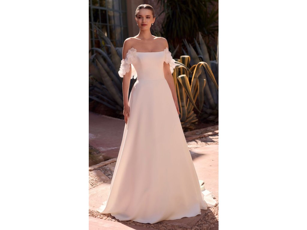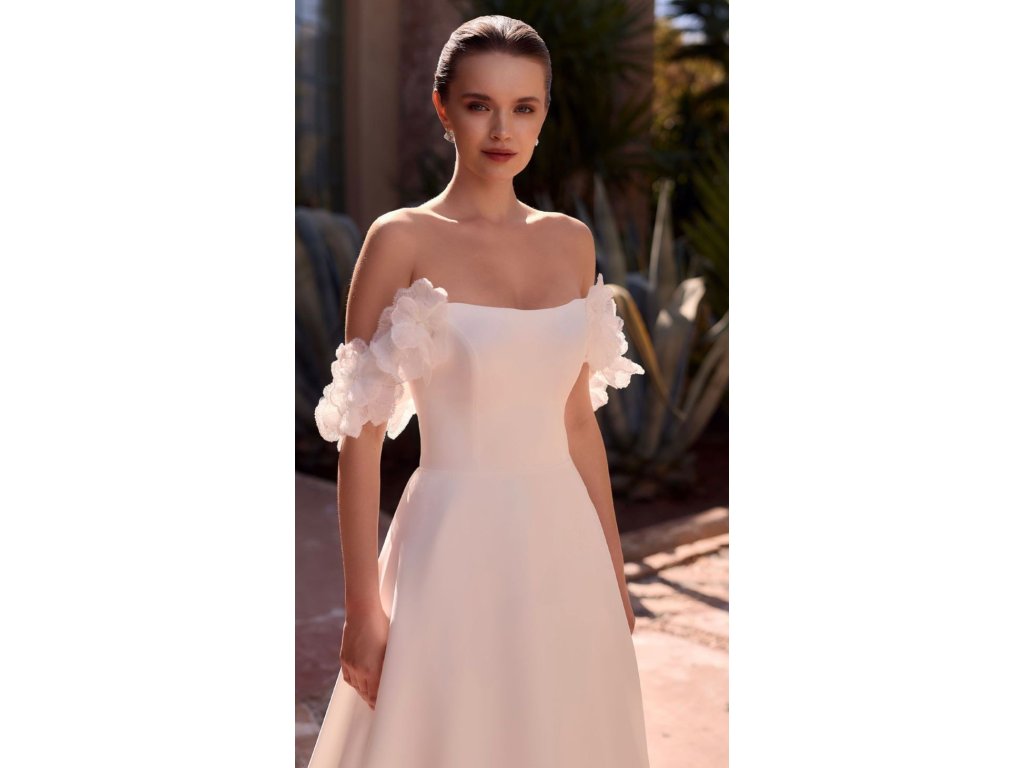 Svadobné šaty model Betsi očaria čistým minimalistickým strihom doplneným o romantické spustené rukávy s 3D kvetmi. Elegantná silueta a jemné detaily vytvárajú nadčasový a ženský look.