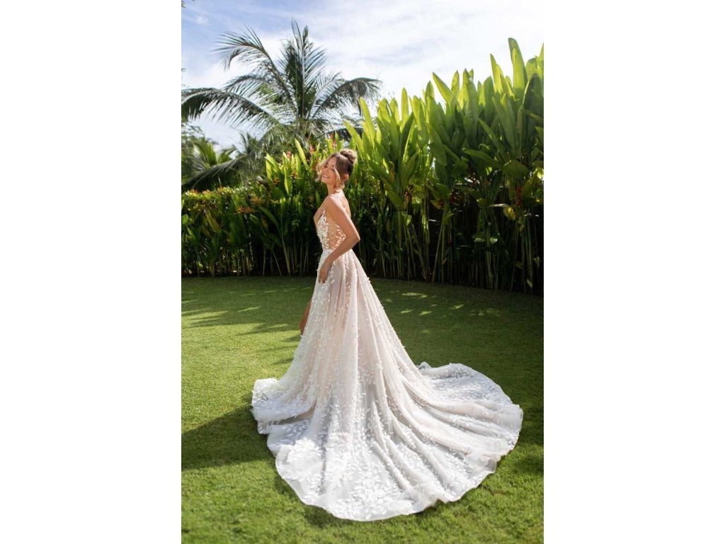 Tento model je dokonalou kombináciou boho štýlu, romantiky a jemnej zvodnosti – ideálny pre nevestu, ktorá chce pôsobiť prirodzene, uvoľnene a zároveň výnimočne.