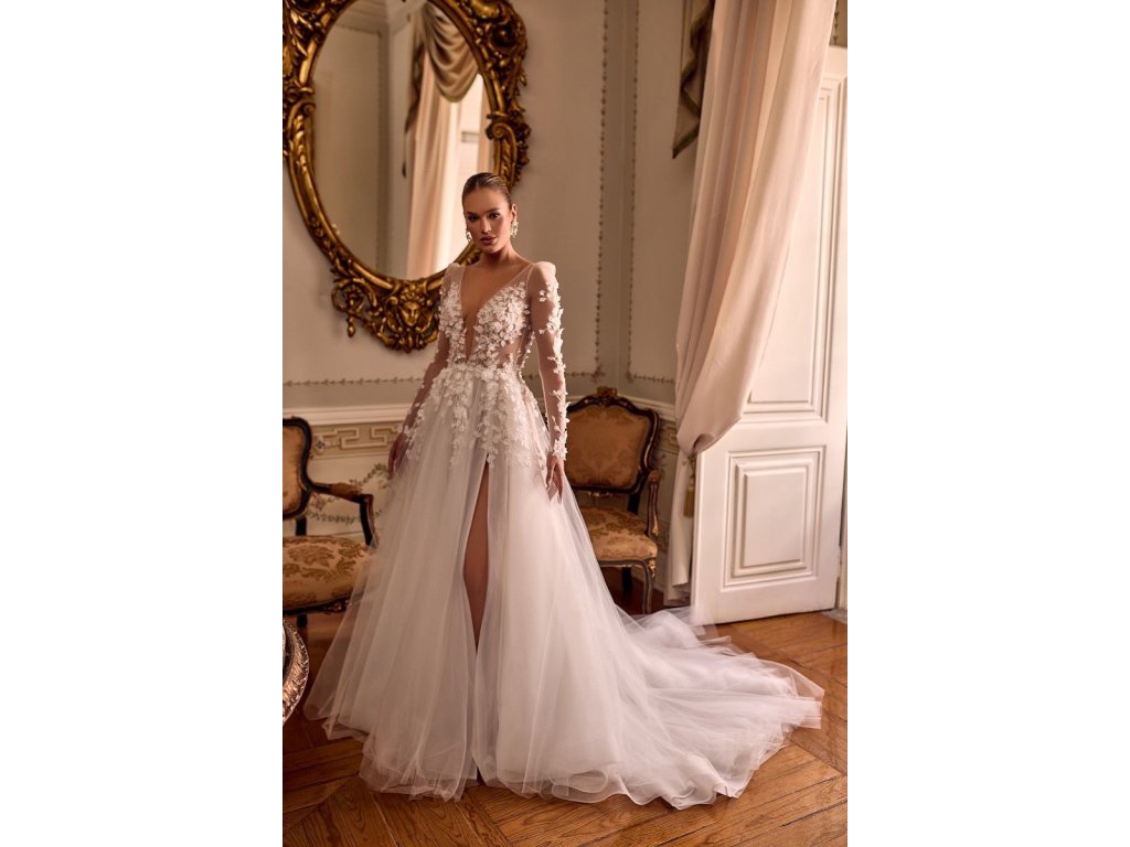 Romantické svadobné šaty s jemným transparentným živôtikom, 3D kvetinovými aplikáciami a vzdušnou tylovou sukňou s rozparkom. Elegantný a zároveň zvodný model pre nevestu, ktorá chce zažiariť.