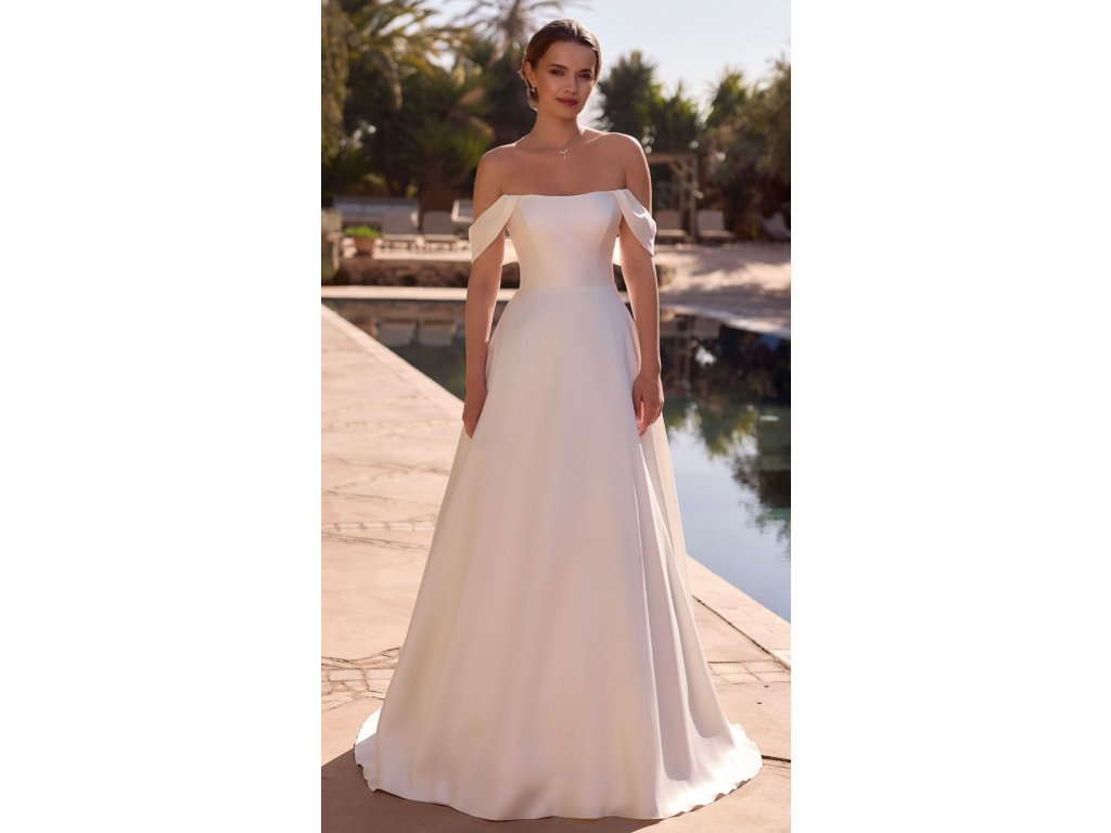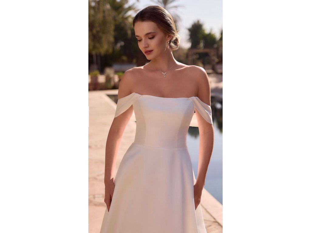 Minimalistické svadobné šaty s čistým korzetovým vrchom a jemne spustenými rukávmi pôsobia elegantne a nadčasovo. Hladká sukňa krásne zvýrazňuje siluetu a dodáva modelu sofistikovaný vzhľad.