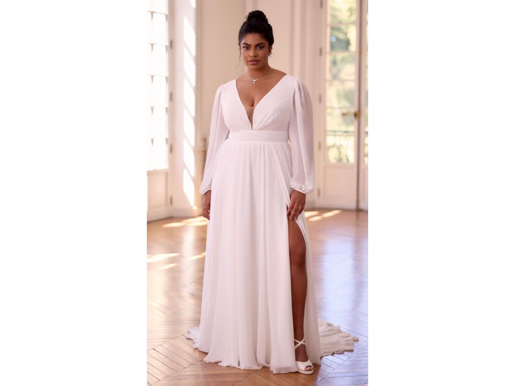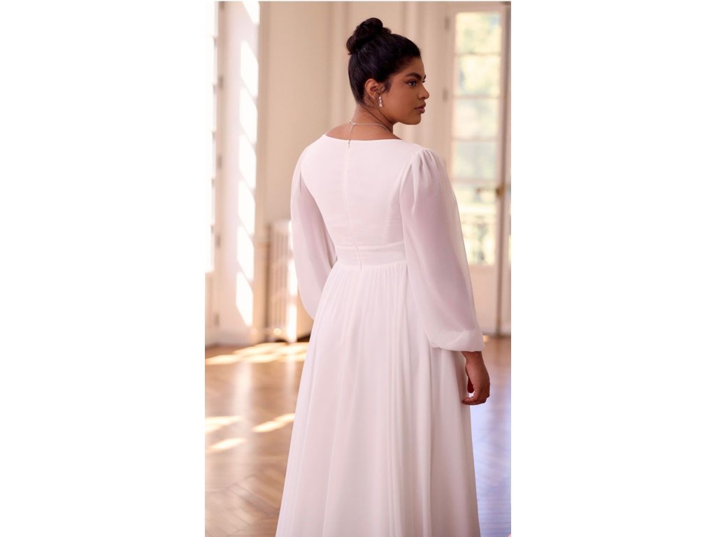 Elegantné svadobné šaty s jemným výstrihom do V, splývavým strihom a vzdušnými rukávmi pôsobia romanticky a nadčasovo. Pohodlný materiál krásne lichotí postave a zvýrazňuje ženskosť.