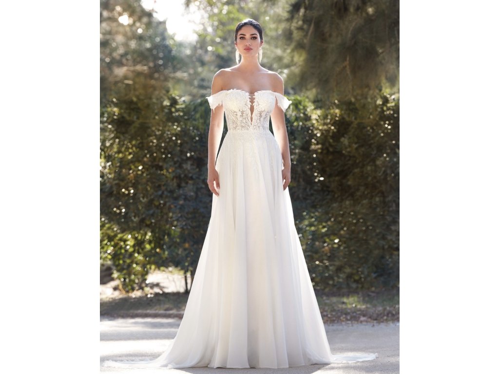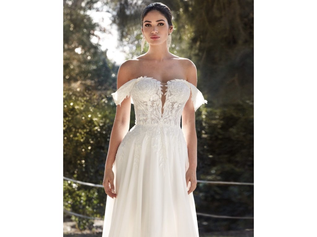 Romantické svadobné šaty s čipkovaným korzetom, spustenými rukávmi a jemnou splývavou sukňou pôsobia nežne a elegantne. Ideálny model pre nevestu, ktorá túži po nadčasovej kráse.