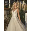 Pri svadobných šatách to platí dvojnásobne, že trblietok nikdy nie je dosť! Prinášame Vám tieto krásne, romantické svadobné šaty. Tento model je vo veľmi príjemnej, jemnej marhuľkovej farbe a vo veľkosti 36. Z estetického hľadiska pôsobia šatky priam božsky! Majú širokú sukňu zloženú z niekoľkých vrstiev tylu, ktorá je obsypaná trblietkami, čo naozaj dodáva ten správny šmrnc týmto šatkám. Čo sa týka vrchného dielu, môžeme vidieť našitú krajku na telovom tyle. Šaty sú na hrubšie ramienka a taktiež v dekolte sa nachádza telový tyl. Na zadnej strane sa taktiež nachádza výstrih do tvaru V. Spolu so všetkými prvkami vytvárajú tieto šaty akúsi harmóniu a všetko na nich je oku lahodiace.