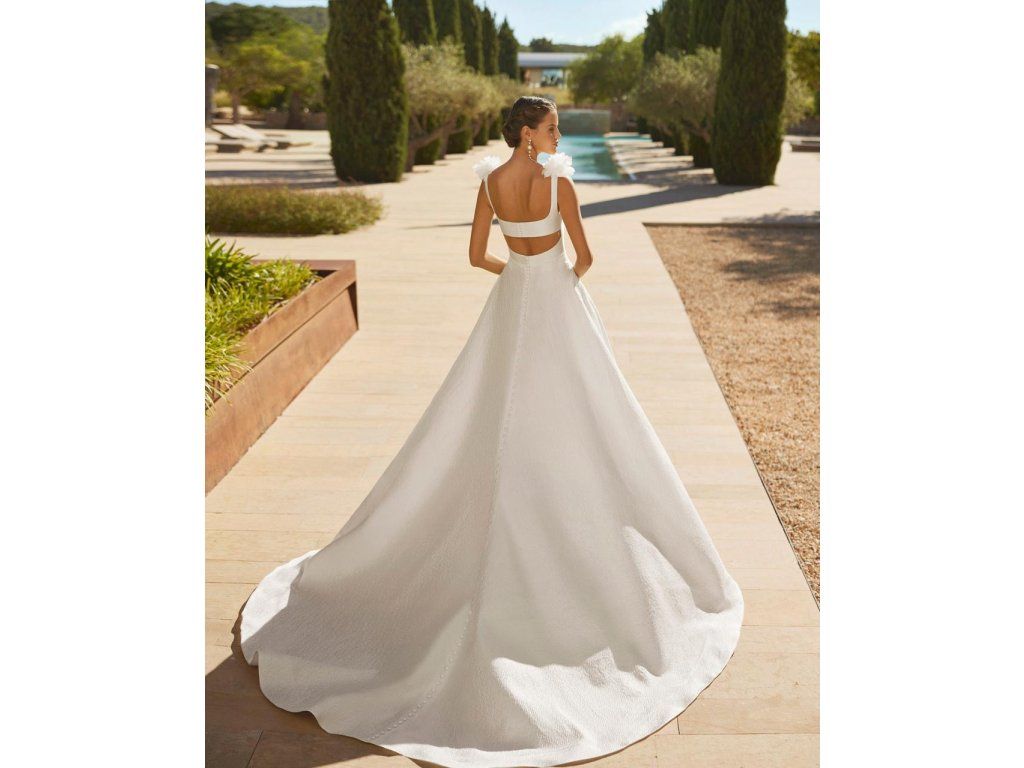 Ak hľadáš elegantné svadobné šaty s áčkovou sukňou, minimalistickým vzhľadom a moderným detailom, tento model je tou správnou voľbou.