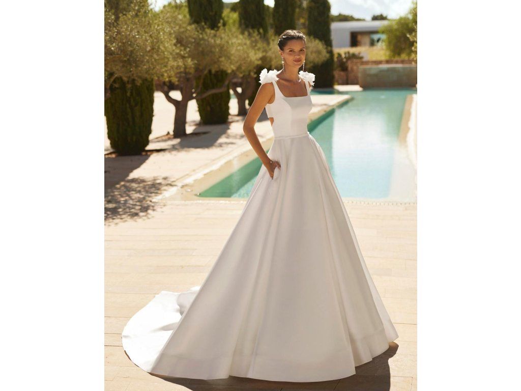 Elegantné svadobné šaty s minimalistickým dizajnom, áčkovou sukňou a výrazným detailom na ramenách. Ideálne pre nevesty, ktoré hľadajú moderné, čisté a nadčasové svadobné šaty.