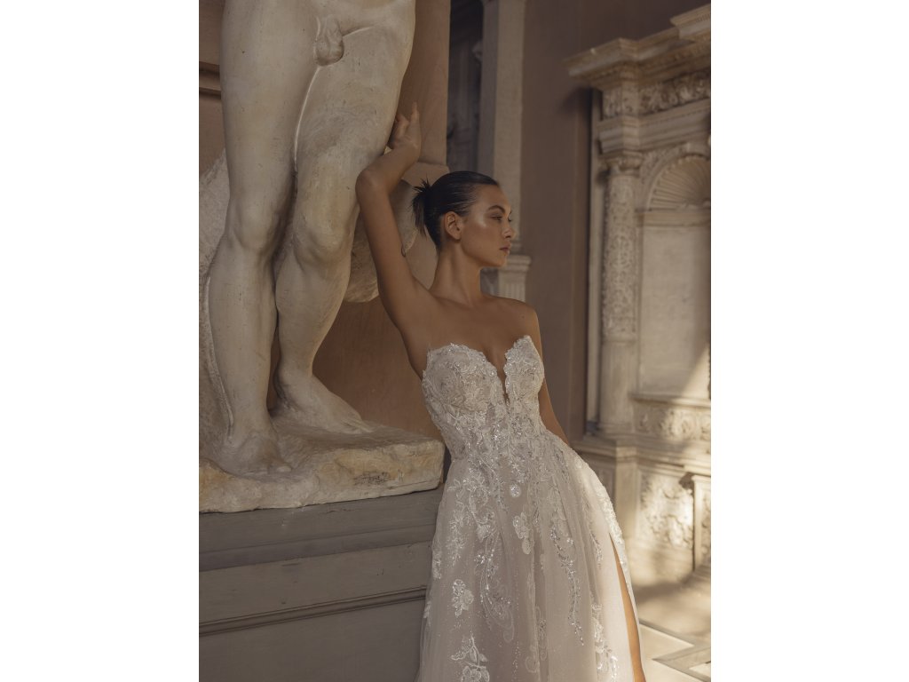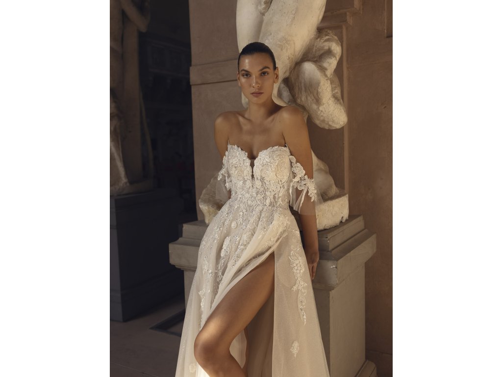 Tento model je harmonickým spojením jemných detailov, ženskosti a moderného štýlu – ideálny pre nevestu, ktorá chce pôsobiť elegantne, sebavedomo a nezabudnuteľne.