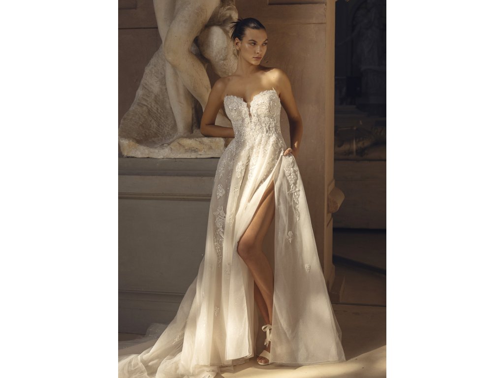 Elegantné svadobné šaty s korzetovým vrchom zdobeným čipkou a jemnou tylovou sukňou s vysokým rozparkom. Romantický a zároveň zvodný model pre nevestu, ktorá chce vyniknúť.